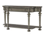Lexington Oyster Bay Sands Point Sideboard in Pelican Gray 717-869. A graceful serpentine front and turned legs creates a classic profile ideal for nearly any environment. There is one full extension drawer for storage. PELICAN GRAY finish - Series 717 Casual transitional designs crafted in quartered Mahogany veneers and select hardwoods in a gently distressed finish, with custom hardware in an antique pewter finish. Certain items feature textured metal bases finished in antique pewter, and burnished stainless steel tops.