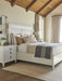 Tommy Bahama Ocean Breeze Royal Palm Louvered California King Panel Bed in White. The iconic plantation shutter design in the headboard of the bed make it a classic silhouette when paired with the platform footboard, side rails, and tapered feet.