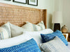 Tommy Bahama Home Los Altos King Ivory Coast Woven Bed in Natural Oak 566-134C. The distinctive Ivory Coast bed features a contemporary shelter design wherein the headboard and footboard curve inward to the outer edge of the mattress. Braided banana leaf on the headboard, footboard and side rails showcases the indigenous materials of travels to exotic destinations.