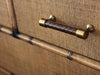 Highly versatile, the 4-drawer chest features leather-wrapped bamboo carved moldings, a raffia top, drawer fronts and end panels and a protective glass top. The chests can be used in a bedroom or paired with a mirror in a foyer to create a distinctive look. The chest is also available in custom Red Coral and Pacific Teal finishes.