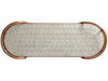 Tommy Bahama Palm Desert Toscana Rattan Mobile Bar Cart in Sierra 575-862. Rattan frame with leather strapping, top shelf is Capiz shell, middle shelf is tempered glass and bottom shelf is diamond-patterned sugar cane. Metal galleries on second and bottom shelves are in gold-finished silver leaf. Casters.