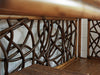 The serving console offers a distinctive look, featuring twisted rattan fretwork on the end and back panels, finished in a rich umber coloration. The top surface features beveled tempered glass. The shelf below is crushed bamboo. Two drawers at the bottom offer ample storage behind woven raffia fronts.