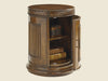 This round end table showcases several Bali Hai design motifs including the decorative carved braid, framed pencil rattan door panel and intricate detailing of woven rattan in the hardware. Its top is compromised of quartered Cherry veneer with a beautiful Maple border and Ebony inlay. It features one adjustable shelf behind the door.