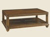 Thoughtful detailing define this rectangular cocktail table. A quartered Cherry veneer top with Maple border and Ebony inlay highlight its decorative braid motif under the top frame. Pencil rattan legs, classic bun feet and a wood framed woven rattan shelf complete the island look.