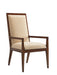 Tommy Bahama Home Island Fusion Natori Slat Back Arm Chair in Cresting Waves (Set of 2) 556-881-01. Inspired by cresting ocean waves, the dining arm chair features a conetmporary art deco geometric pattern in a warm gold coloration, which is enhanced by exposed wood slats on the chair's back. Available as shown in Cresting Waves fabric. With a refined yet restrained aesthetic, Pan-Asian design ascribes great value to visual composition, clean disciplined lines and the goal of infusing tranquility into today's contemporary decor. Island Fusion embraces the Zen side of Tommy Bahama Home, with bold designs that blend horizontal and vertical elements, dramatic statement hardware and accents of eclectic natural materials that offer a unique look to every piece. The result is a striking modern expression of personal style, with a vibe that feels relaxed and livable. Statement pieces define the room, while custom upholstery offers an invitation to enjoy the laid-back comfort of casual sophisticated living.