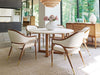 Tommy Bahama Palm Desert Eagle Falls Sideboard in Sierra 575-869. Casual Contemporary designs crafted from quartered hickory veneers and select hardwoods in a sundrenched Sierra tan finish. Accents include twisted lampakanai rope, woven raffia, hand-applied pencil rattan, veneered Anticato marble, gold-finished silver leaf, custom acrylic, and crushed white and gold Capiz shell. Custom hardware and metal accents are finished in brushed gold. Left and right side facing has one door with pencil rattan front, touch-to-open latch hardware, and one adjustable shelf. The center has an inverted breakfront design, three felt lined soft-close drawers with raffia fronts, top drawer is divided for silver, and a stationary shelf at base.