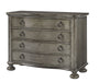 Lexington Oyster Bay Sandy Ridge Bachelor's Chest in Pelican Gray 717-624. The 48-inch chest, with a soft serpentine front, decorative ring pulls, turned legs and silver-gray finish offers a dramatic nightstand option for the master bedroom. Designs feature an eclectic mix of traditional elements like button-tufting, breakfront profiles and turned legs with more transitional features like geometric metal bases, burnished stainless steel tops and natural materials.
