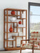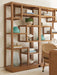 Tommy Bahama Palm Desert Bryce Raffia Etagere in Tan 575-990. Casual Contemporary designs crafted from quartered hickory veneers and select hardwoods in a sundrenched Sierra Tan finish. Split rattan wrapped wooden frame, 9 asymmetrical stationary wooden shelves, open back and end panels, and a recessed plinth base finished on all sides.